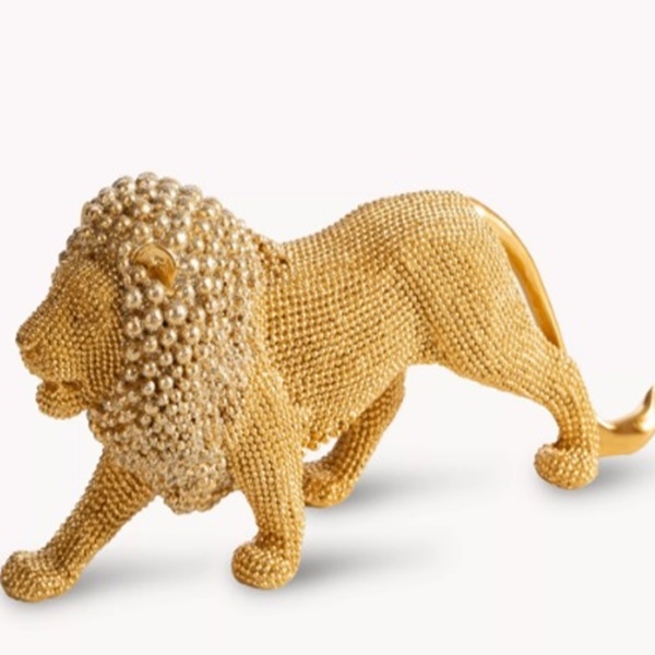 Złota figurka lwa sprawdzi się w modnych wnętrzach urządzonych z przepychem, a także w modnym stylu glamour. Figurka ELDO pokryta jest drobnym wytłaczanym wzorem, w formie maleńkich koralików, który dodaje jej wyjątkowego charakteru.