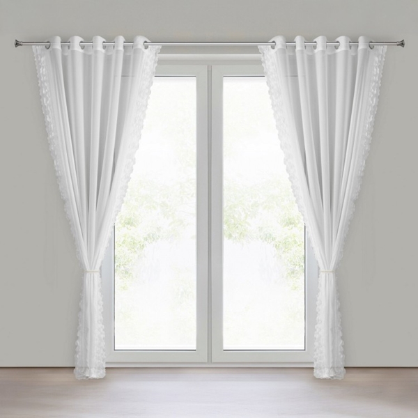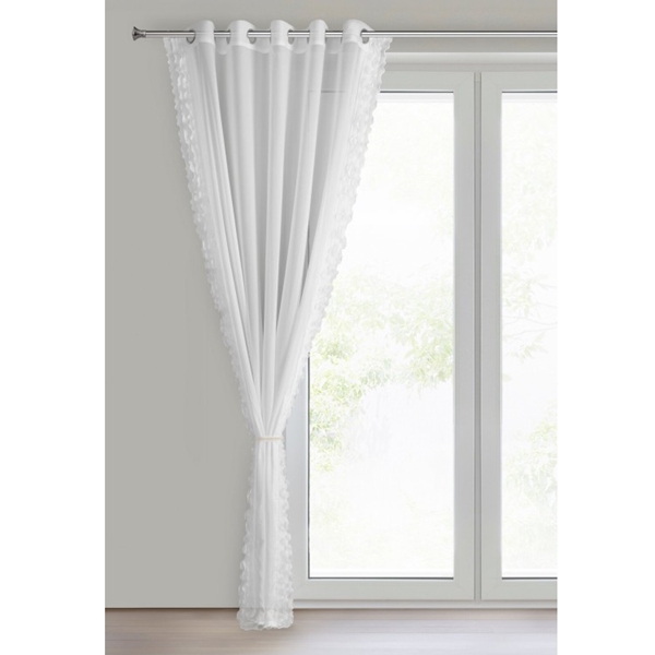 Subtelna i dekoracyjna firana gotowa, uszyta z lekkiej tkaniny szyfonowej, która pięknie rozprasza światło i nadaje wnętrzu delikatnego charakteru. Boki firany zdobią plisowane falbanki, tworzące efektowne wykończenie. Do kompletu dołączono ozdobny troczek z perełkami, umożliwiający eleganckie upięcie firany. Dzięki zawieszeniu na przelotkach firana układa się w regularne fale i jest niezwykle prosta w montażu.