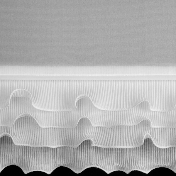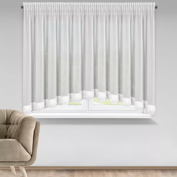 U dołu firanę zdobi efektowne, drobne marszczenie tworzące dekoracyjną falbankę, która dodaje całości romantycznego, delikatnego charakteru.