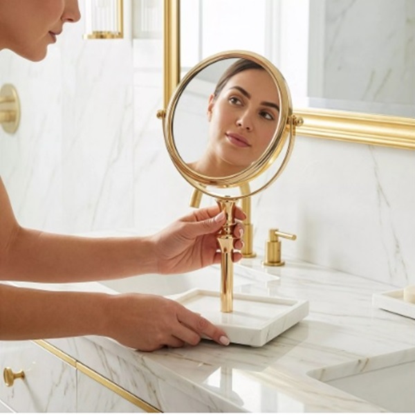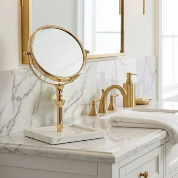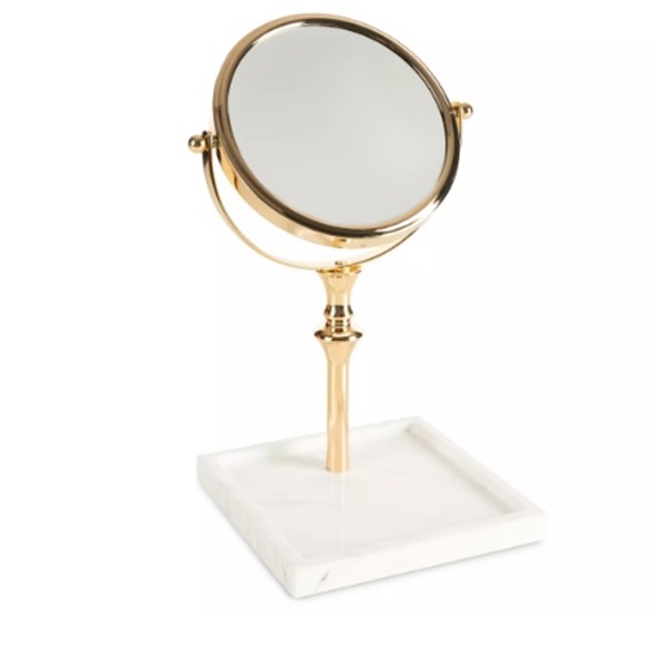 Eleganckie okrągłe lusterko, które łączy nowoczesny design z klasycznym wyrafinowaniem. Jego smukła, złota metalowa rama nadaje mu subtelnej elegancji, a solidna marmurowa podstawa zapewnia stabilność i luksusowy wygląd.