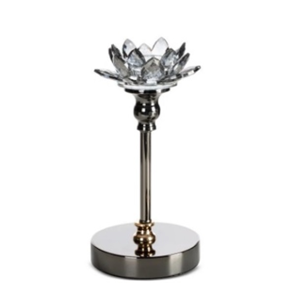 Wnieś do swojego wnętrza subtelny blask i szyk dzięki wyjątkowemu świecznikowi inspirowanemu formą kwiatu lotosu. Kryształowe płatki pięknie odbijają światło świecy, tworząc efektowne refleksy, które dodają przestrzeni elegancji i przytulności. Stabilna podstawa w połyskującym wykończeniu harmonizuje z delikatnie opadającymi płatkami, tworząc kompozycję idealną do wnętrz glamour, modern classic oraz nowoczesnych.
