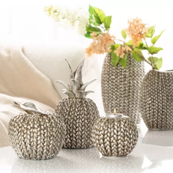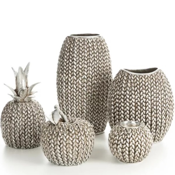 Okrągły świecznik MOLI  na tealight z żywicy poliestrowej to elegancki i oryginalny dodatek, który łączy funkcjonalność z estetyką. Cała powierzchnia świecznika zdobiona jest wzorem imitującym pleciony sweterek, co nadaje mu ciepły i przytulny wygląd, przypominający miękki, ręcznie robiony dzianinowy akcent. Wzór splotu tworzy interesujący kontrast z nowoczesnym materiałem, dodając świecznikowi unikalnego charakteru.
