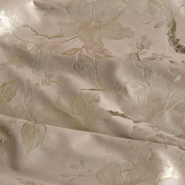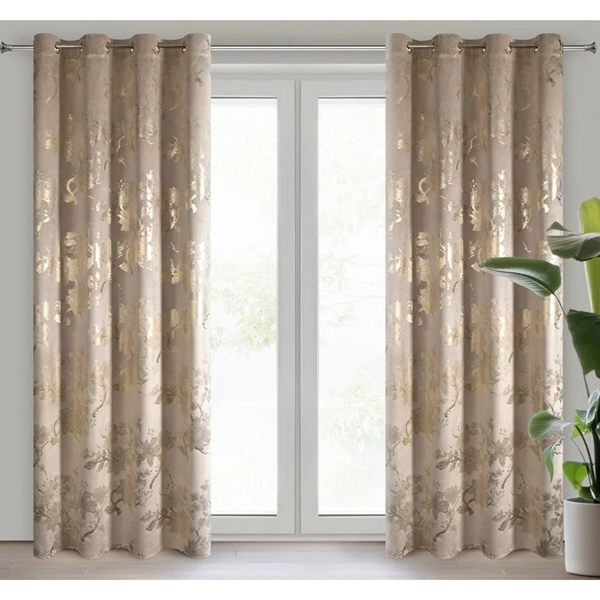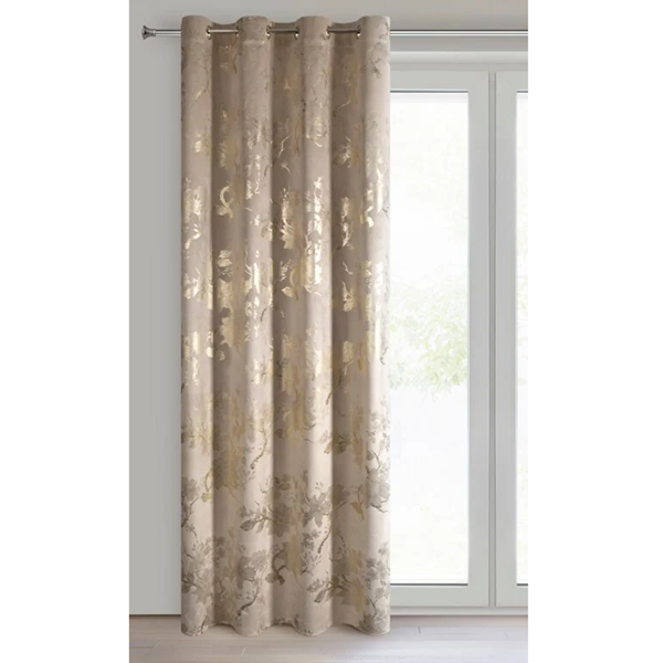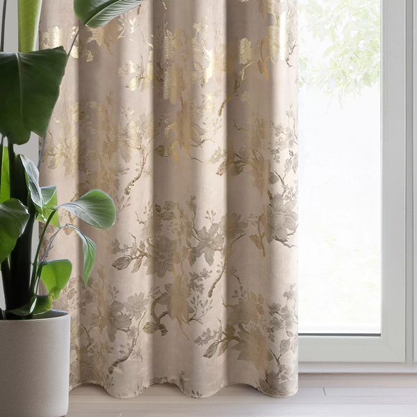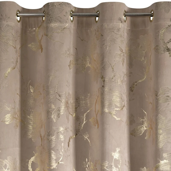 Zasłona wykonana z wysokiej jakości welwetu, zasłona wyróżnia się miękkością i delikatnym połyskiem, który pięknie odbija światło, tworząc subtelny, elegancki efekt. Błyszczący nadruk kwiatów na powierzchni tkaniny dodaje jej wyrafinowania i naturalnej lekkości, wprowadzając do wnętrza delikatny motyw roślinny. Sposób zawieszenia to klasyczne przelotki, które zapewniają szybki i łatwy montaż.